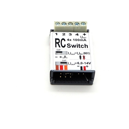 RC-switch er forbundet til en ledig kanal på modtageren, og funktionerne kan skiftes med et langt og kort tryk ved hjælp af en 3-vejs switch eller knap. Forsyningsspænding fra modtagerens BEC eller en ekstern kilde 6 til 14 volt. Maks. 4 x 100 mA.